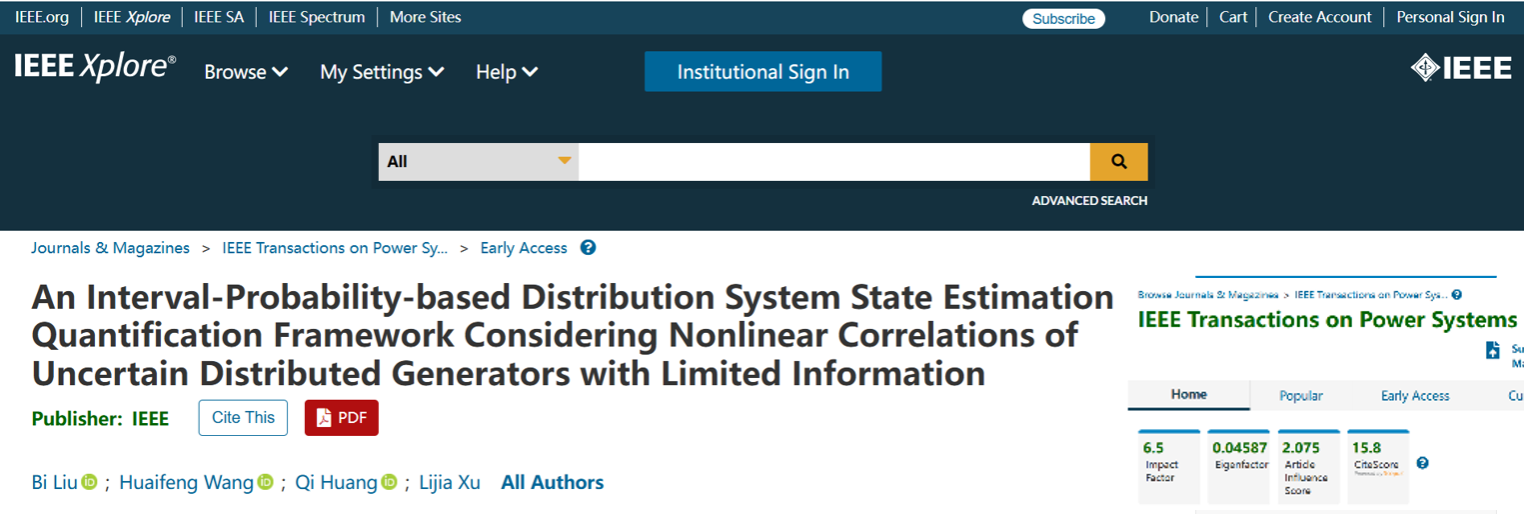 近日,机电学院新型电力系统分析与控制实验室在电力系统状态估计领域取得突破,在电力系统顶级期刊(Top一区)《IEEE Transactions on Power Systems》上发表题为《考虑分布式发电系统有限测量信息情况下非线性相关性的配电网区间概率状态估计理论框架》的研究论文。该论文以学院青年教师刘碧副教授为第一作者及通讯作者,机电学院硕士研究生王怀沣、电子科技大学黄琦教授(中国科学技术发展战略研究院院长,IEEE Fellow)、机电学院许丽佳教授(机电学院院长)为合作作者,tyc41183太阳成集团为第一署名单位。