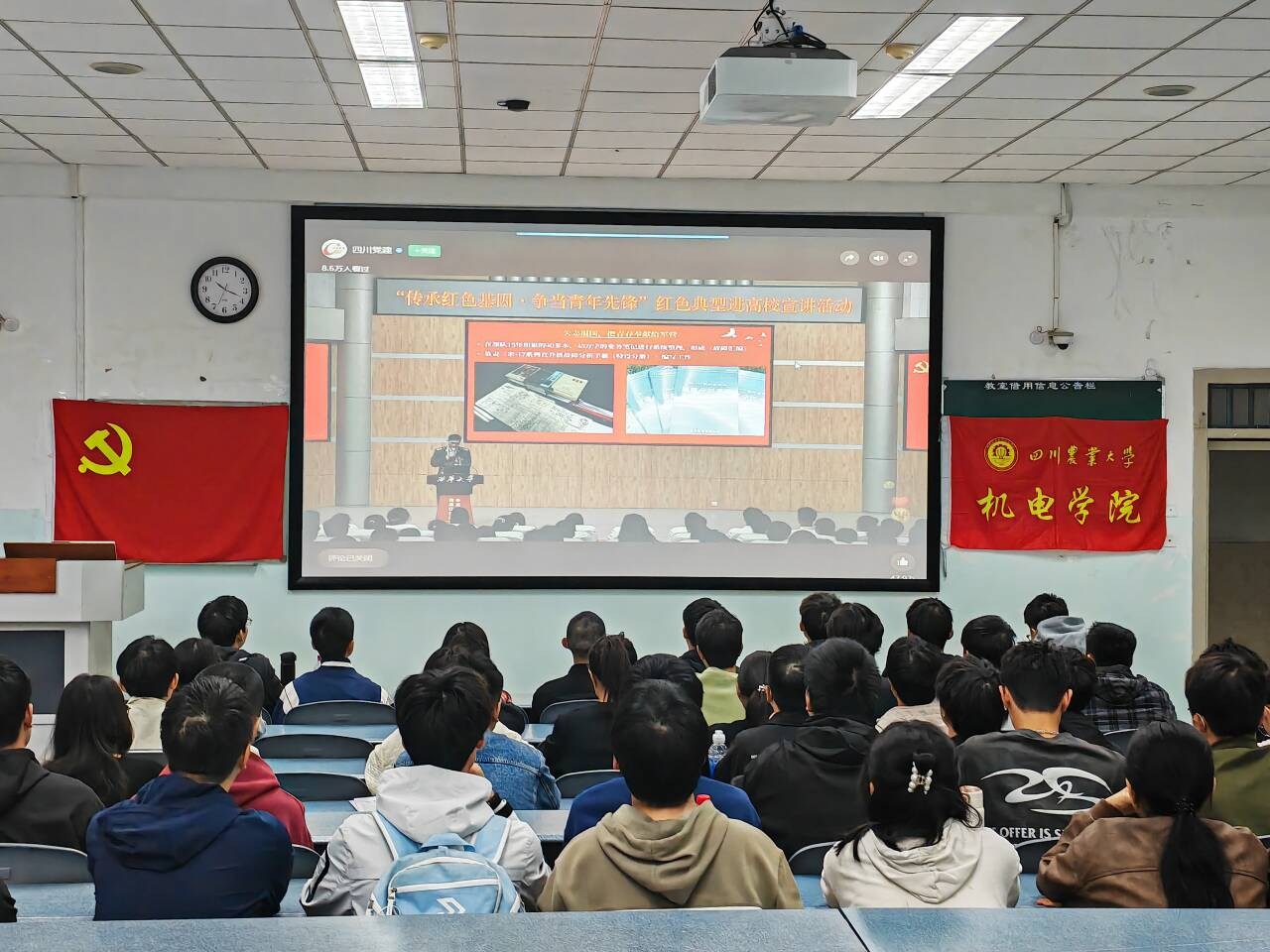 4月3日,由省委组织部、省委教育工委联合开展的2024年“传承红色基因·争当青年先锋”红色典型进高校宣讲活动在西华大学郫都校区举行,机电学院采取“集中+自学”相结合的方式,组织全院师生党员、入党积极分子、入党申请人、共青团员等通过“四川党建”视频号准时观看直播。