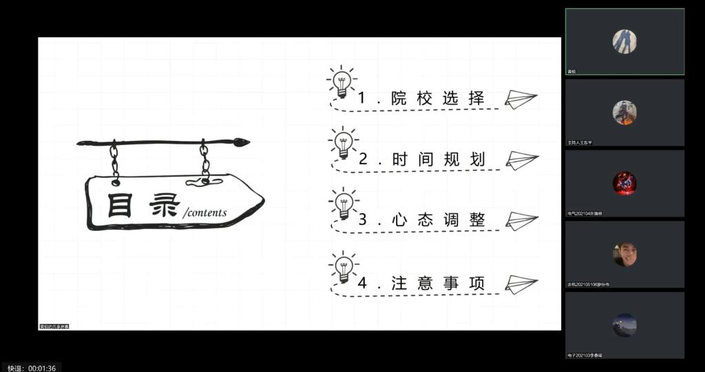 “研途有你”考研经验分享会上,相继邀请上岸至北京邮电大学黄锐、西安电子科技大学的林俊志、湖南大学张盛等6名优秀校友分享自己院校研究生招生和考试科目设置、考研流程等情况,重点从考研的初衷、备考期间的学习时间安排、各应试科目的准备、考研复习资料推荐、目标院校选择、考前冲刺、复试备战等方面为考研学生传授经验、指点迷津。