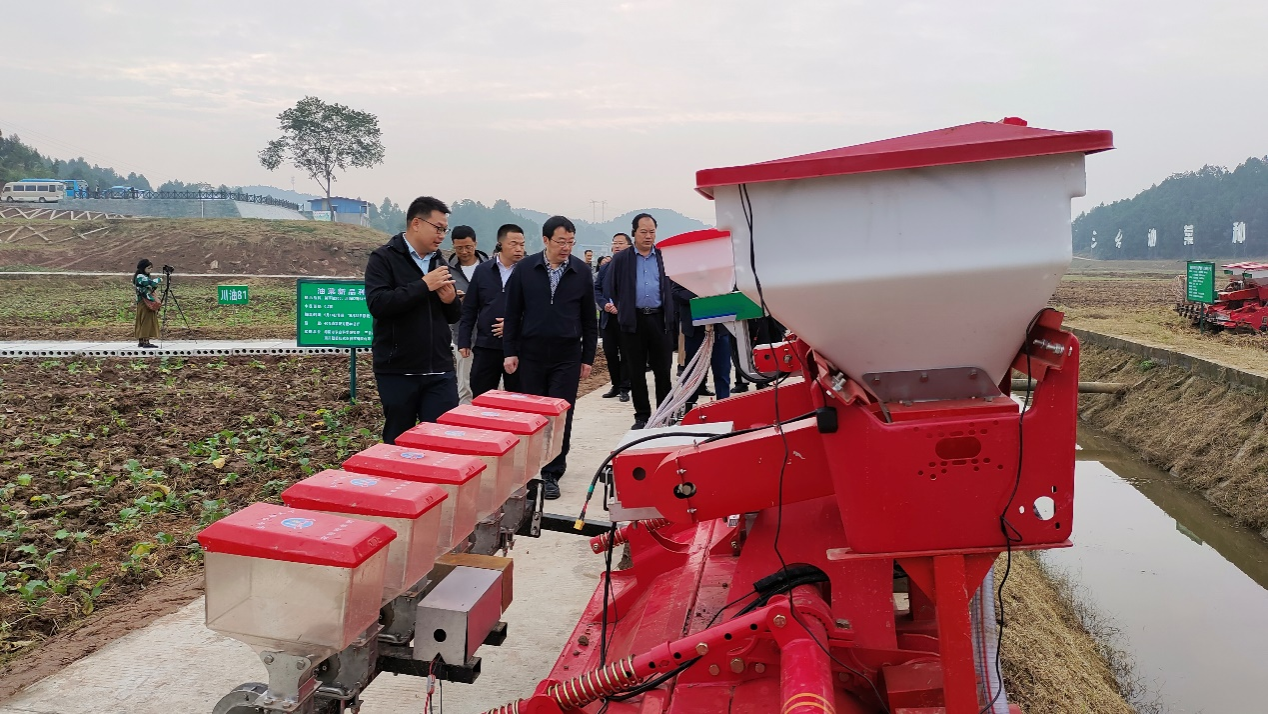 现场展示了由tyc41183太阳成集团自主研发、四川耀农农业装备有限公司生产制造以“开沟做厢排湿、集中排种排肥、同步驱动控制”为核心的3款油菜精量联合播种机,该类播种机能够适应含水率40%以下的油菜播种要求,实现一播全苗,沟型稳定,成行性好。与会领导和专家对进一步提高油菜抗湿机械化播种技术与装备的稳定性和适应性提出了建议,要求各地通过农机农艺融合成套技术与装备推动油菜机械化水平的提升,“天府良机”要为天府菜油做出更多的贡献。