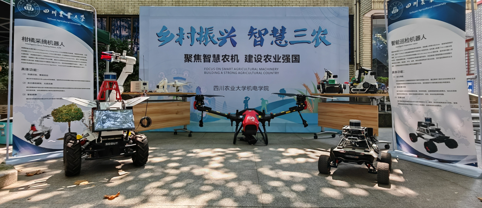 在迎新点位旁,学院专设了一块“智慧农机”展示区,让大一新生们初识现代农业魅力。首先映入眼帘的是左右两侧的柑橘采摘机器人和智能巡检机器人,许多前来报道的新生及家长被其深深吸引,感叹“这个机器人,厉害哟!”。在展示区的展台上,还摆放着3D打印机械臂、农药无人机、探测车等专业设备,在场志愿者们带领新生参观迎新科技点,为他们简单讲解各个设备的用处,吸引了不少新同学的热切关注。他们纷纷表示,专业展示区让他们第一次实实在在感受到了智慧农业的科技特色,也让他们对大学四年的学习生活充满了期待。
