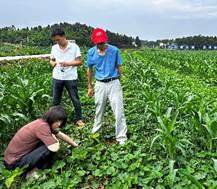 6月30日,团队来到安岳县林凤镇新坝村、高升乡示范地。林凤镇的春大豆毛豆已在收获,进入抢收阶段,但持续干旱易使大豆花荚脱落或籽粒停止灌浆造成瘪粒较多。安岳县的高升乡示范地地区以“2+3”玉米套种大豆模式为主,5月下旬播种的夏播大豆由于植保欠佳,导致杂草较多遮掩了幼苗,造成幼苗生长营养不良。