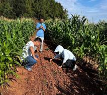 下午,团队来到乐至县中天镇、佛星镇等地,该地区采用玉豆套种模式,人工穴播和机播混合。该地的春大豆已经结荚,但受高温旱情和病虫害影响,大豆结荚质量降低,植株叶片出现孔洞、干边现象;6月下旬播种的夏大豆由于干旱出苗较差。因此,此次阶段性持续高温天气将对大豆及玉米正常生长带来一定的不利影响,若后期雨水不足需及时人工干预。