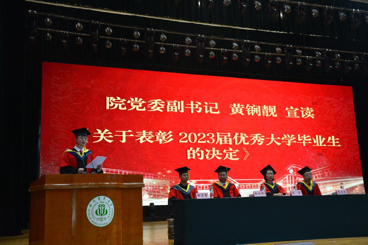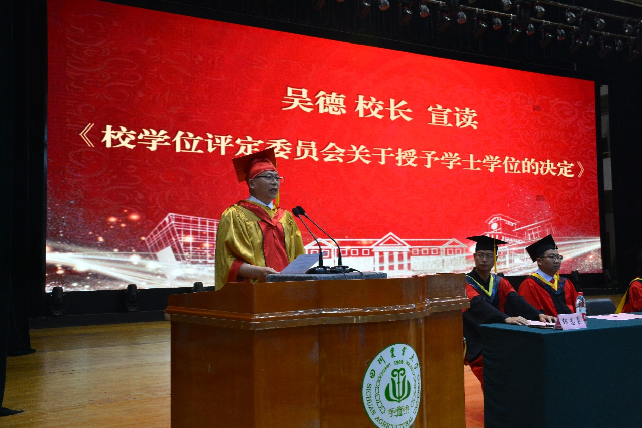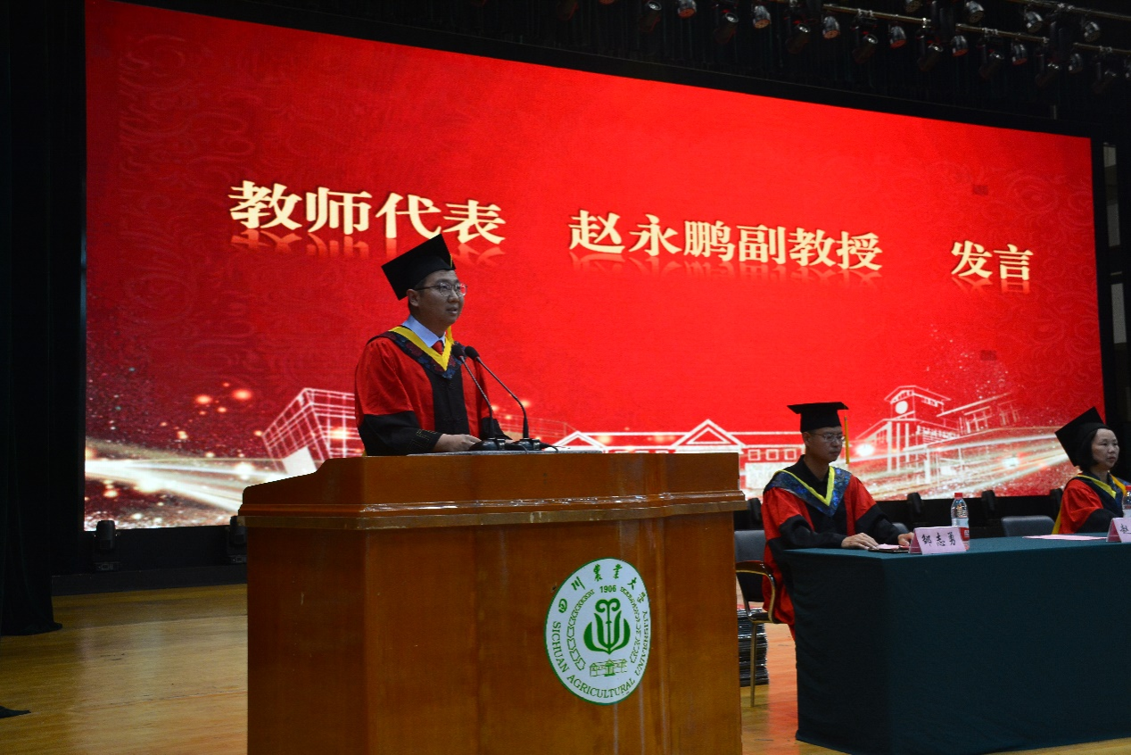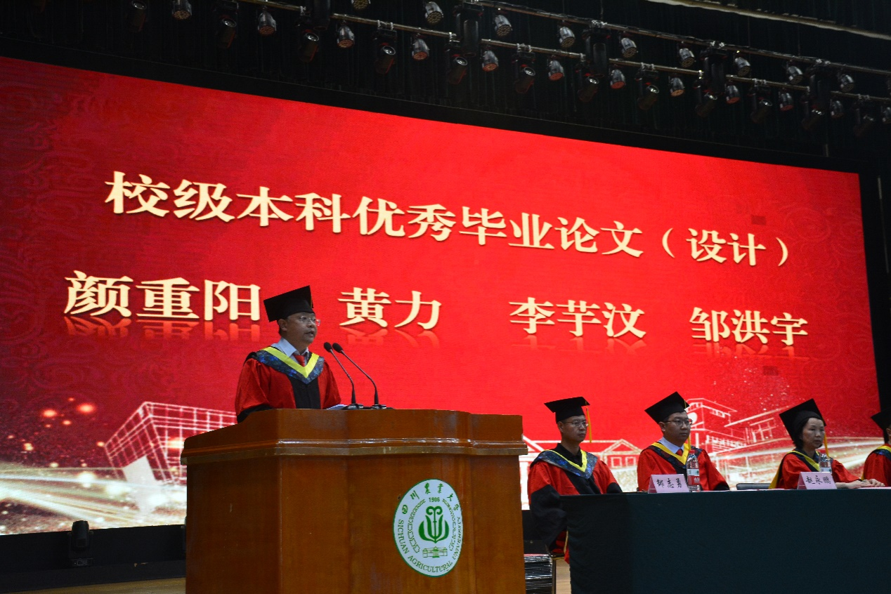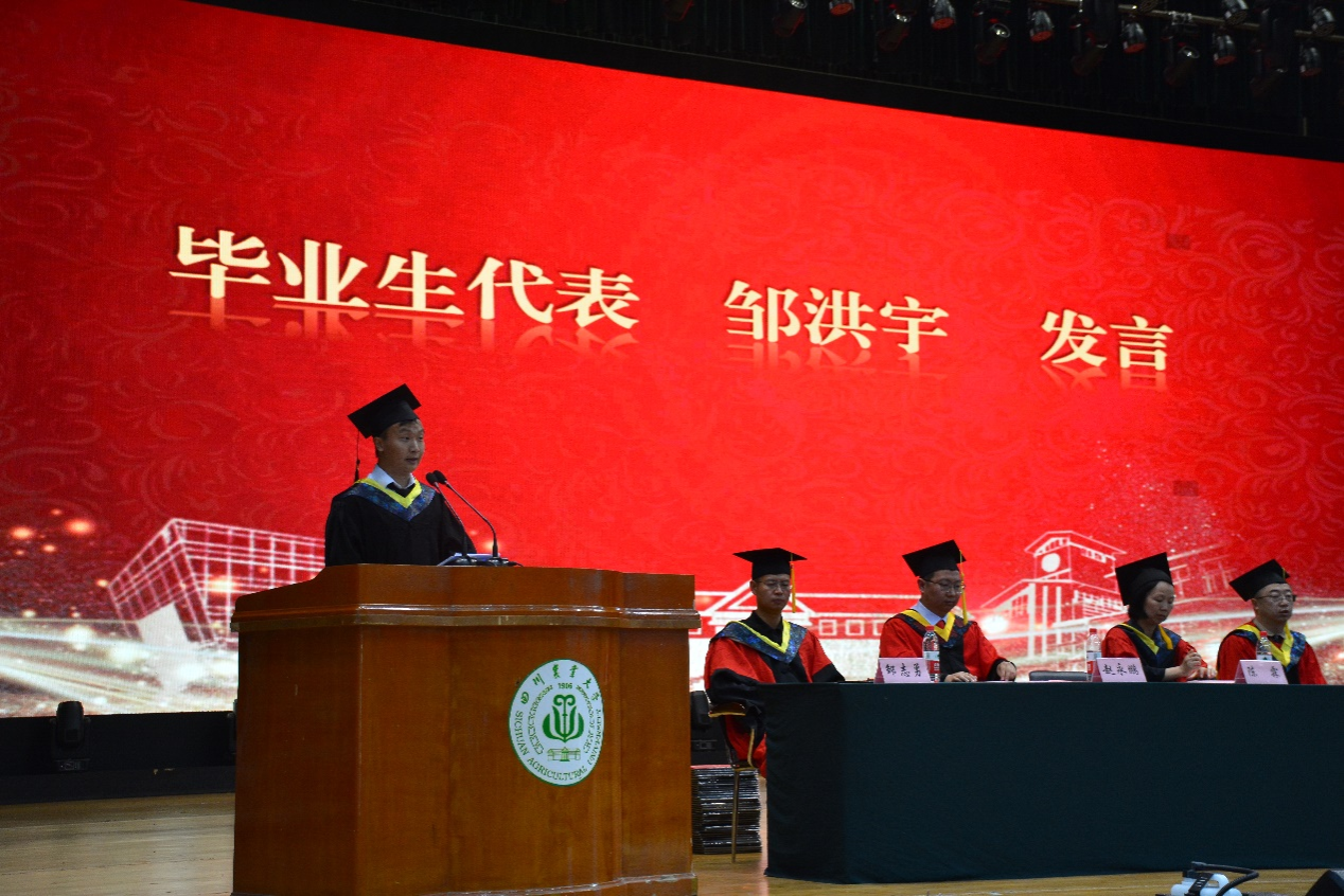 来自农业机械化及其自动化专业的毕业生代表、优秀学生标兵邹洪宇追忆了大学的青葱岁月,对辛勤付出的老师表达了感谢,同时表示将牢记川农大精神,在今后的工作学习中不断成长,成为造福社会的栋梁之材。