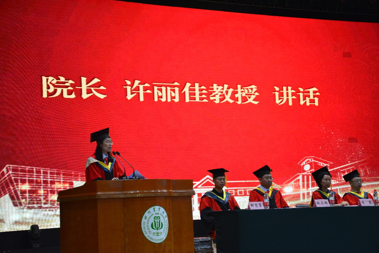 毕业典礼在庄严的国歌声中拉开帷幕,许丽佳院长致辞。她代表教职工对圆满完成学业的2023届毕业生表示热烈的祝贺,同时希望同学们牢记“追求真理,造福社会,自强不息”的校训,肩负使命,立志成才,将川农大精神传播至四海八方。