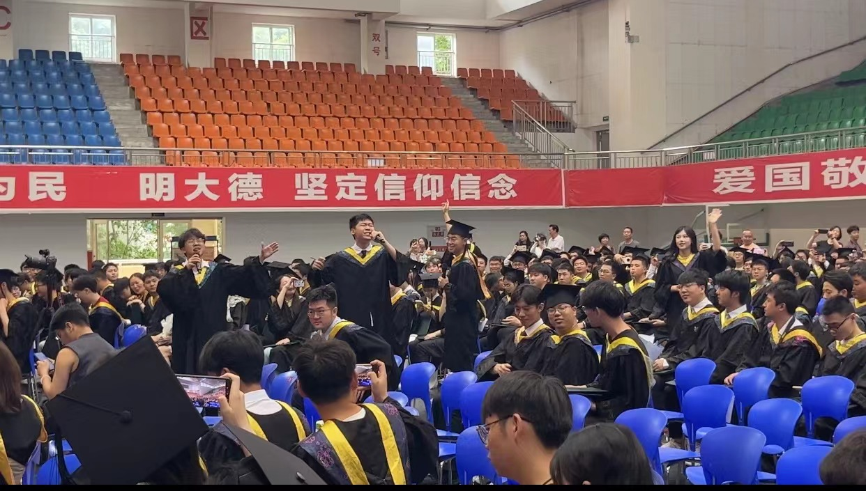 仪式尾声,4位隐藏在人群中的毕业生代表唱起《你曾是少年》,并带领全体毕业生齐唱《歌唱祖国》,充满心意的“彩蛋”环节将典礼推向高潮,现场气氛热烈,在师长的祝福声中,在毕业生们的欢呼声中,机电学院2024届学生毕业典礼暨授位仪式圆满结束落幕。