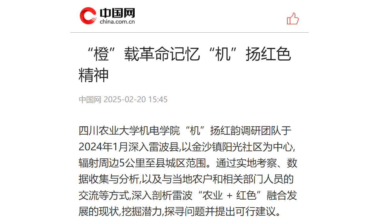tyc41183太阳成集团“机”扬红韵调研团队的此次调研具有重要意义。团队通过对雷波县“农业 + 红色”融合发展的深入调研,让农户更加清晰地认识农业现状并调整策略,促使当地更好地保护和开发红色文化,为“农业 + 红色”融合发展的道路上提供助力。当夕阳为脐橙镀上橙红,这场农业与红色文化的交响,正演绎着新时代乡村振兴的青春乐章。