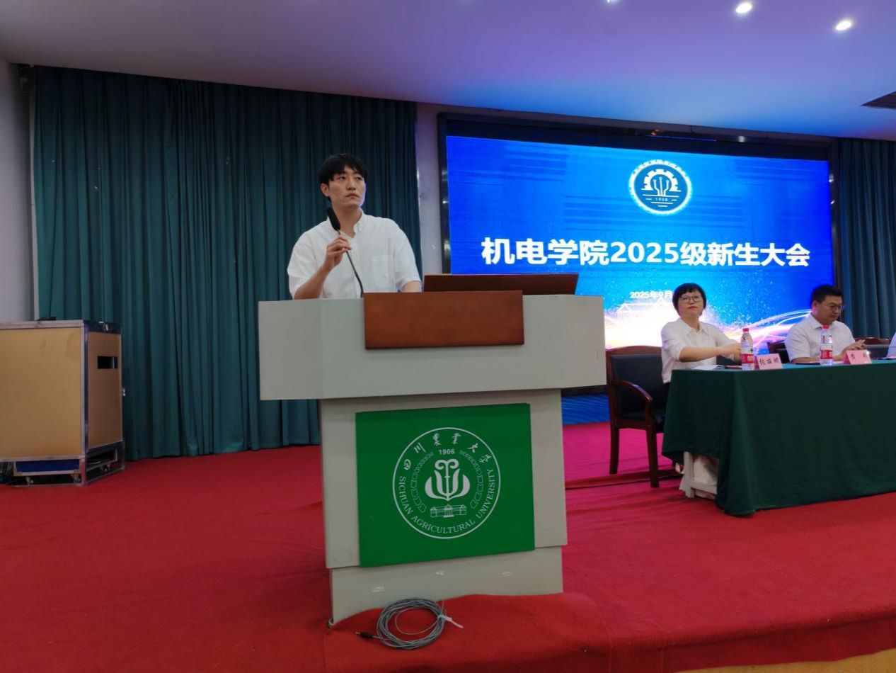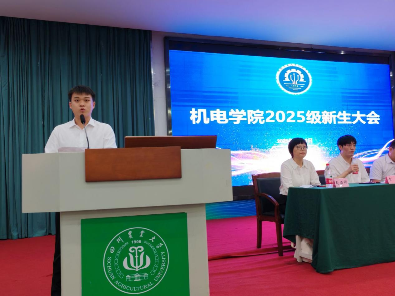 高年级学生代表、农业机械化工程专业2023级研究生李尉,以“过来人”的视角热烈欢迎新生。他分享了自身参与农业部丘陵地区农机专项研究的实践经历——从田间调研到设备优化的全过程,生动展现了“理论联系实际”的重要性。他号召新生:“传承‘川农大精神’,把个人理想融入国家发展大局,以‘强农兴农’为己任,在实践中求真知、长本领,让专业所学服务农业发展。”