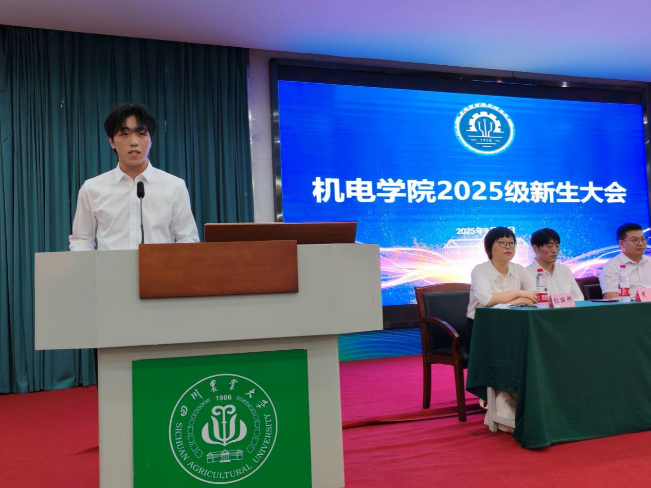 新生代表、2025级农业机械化及其自动化专业本科生杨金瑞,向参与迎新的师生表达了真挚感谢。他讲述了自己选择该专业的初心:“小时候目睹长辈农耕的辛劳,便立志要‘融合传统农业智慧与现代工程技术’,让农业生产更高效、更轻松。”他表示,将以“川农大精神”和学院院训为指引,与同学们一道,用专业所学投身农业现代化建设,为助力民族复兴贡献青春力量。