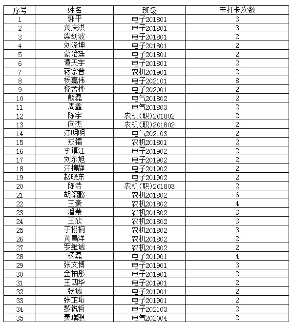 1、对4月5日-12日期间,出现2次及以上未完成每日健康打卡的35名同学进行全院通报。相关名单见下图: