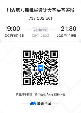 经“第八届机械创新设计大赛暨三维建模设计大赛”组委会老师评审商议,决定于2022年11月15日(第十二周周二)晚上7点30分进行本届大赛决赛答辩,答辩方式为线上答辩,会议号见下方图片。