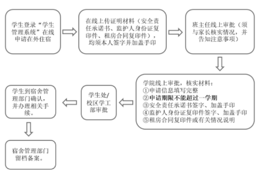 一、根据《学生管理工作规定》要求,学生原则上应在学生公寓住宿,确因本人健康原因等特殊情况需要在外住宿的,必须履行审批手续。未经审批在外住宿的,将按照学校相关规定进行处理。无特殊情况一律不得批准在外住宿申请,禁止租住自建房。另:关于住宿费退费方面,学生需在申请通过后前往宿舍管理处登记退寝,之后财务处将会根据宿舍管理中心的反馈名单退还相应学期住宿费。