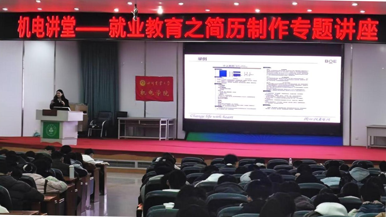 4月1日下午,机电讲堂--就业教育专题讲座“零基础简历制作”在十教小礼堂火热开展。京东方科技股份有限公司校园招聘负责人付于洋受邀担任主讲,围绕“零基础如何写好简历”主题,通过生动案例和互动答疑,为学院400余名大三学生和100余名低年级学生带来了一场实用有趣的求职技能课。