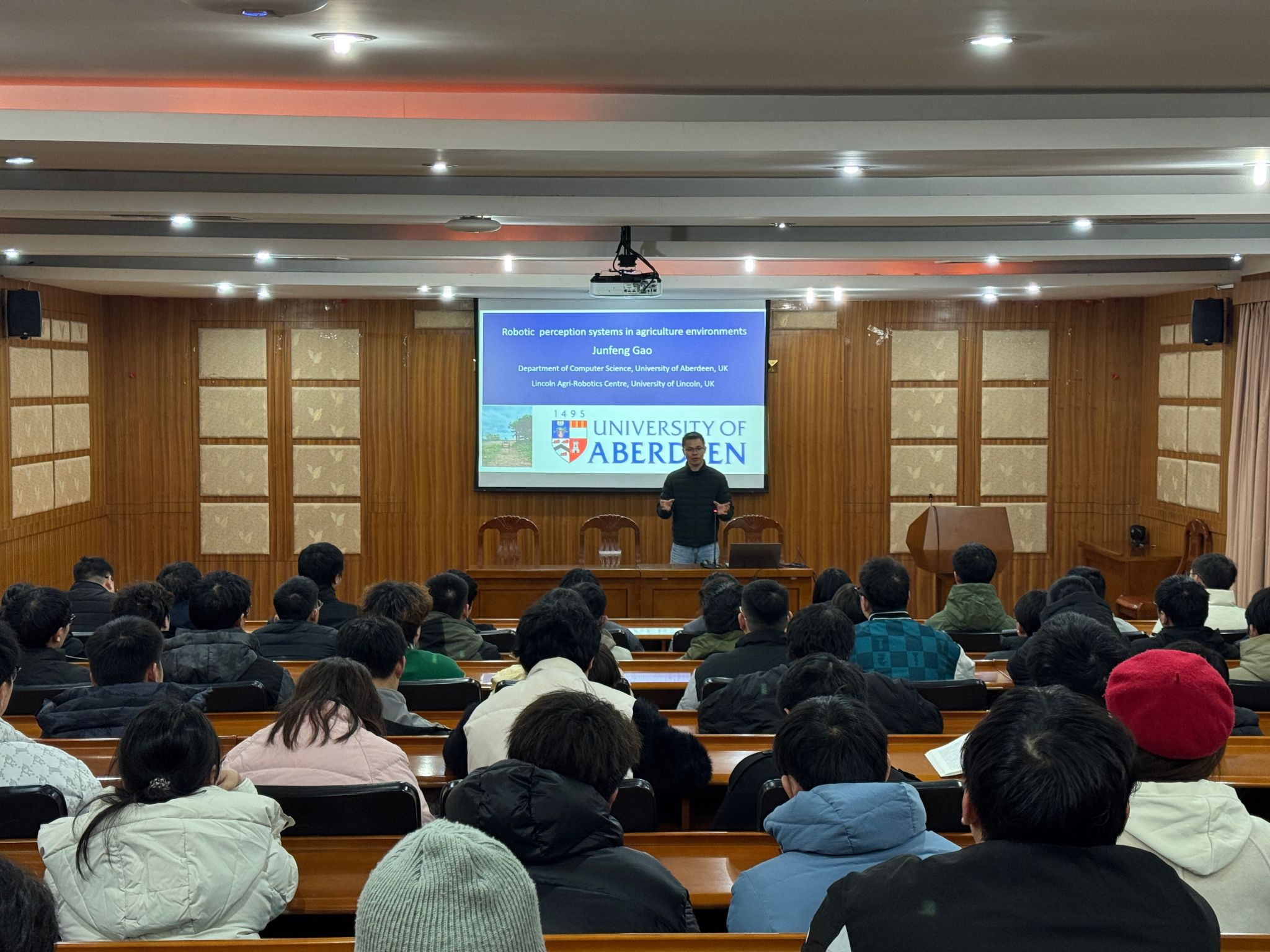 2025年12月16日,我院优秀校友、英国阿伯丁大学长聘教职助理教授、博士生导师高俊峰回到母校,逸夫楼二楼报告厅作题为“面向复杂农业环境的机器人感知系统”的专题讲座。讲座由机电学院副院长张黎骅教授主持,学院师生代表80余人参加了此次讲座。