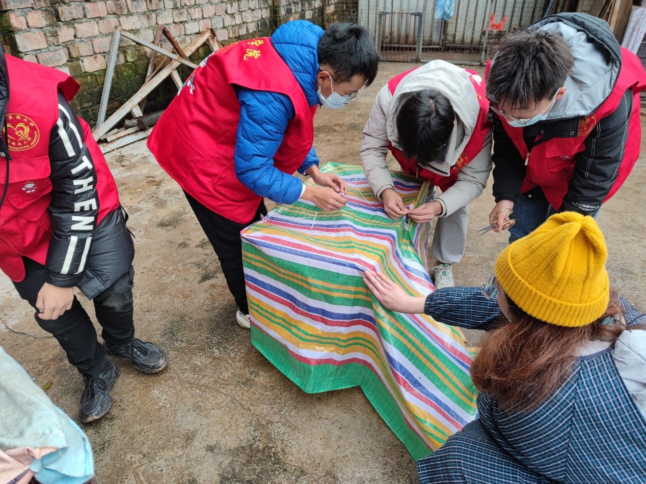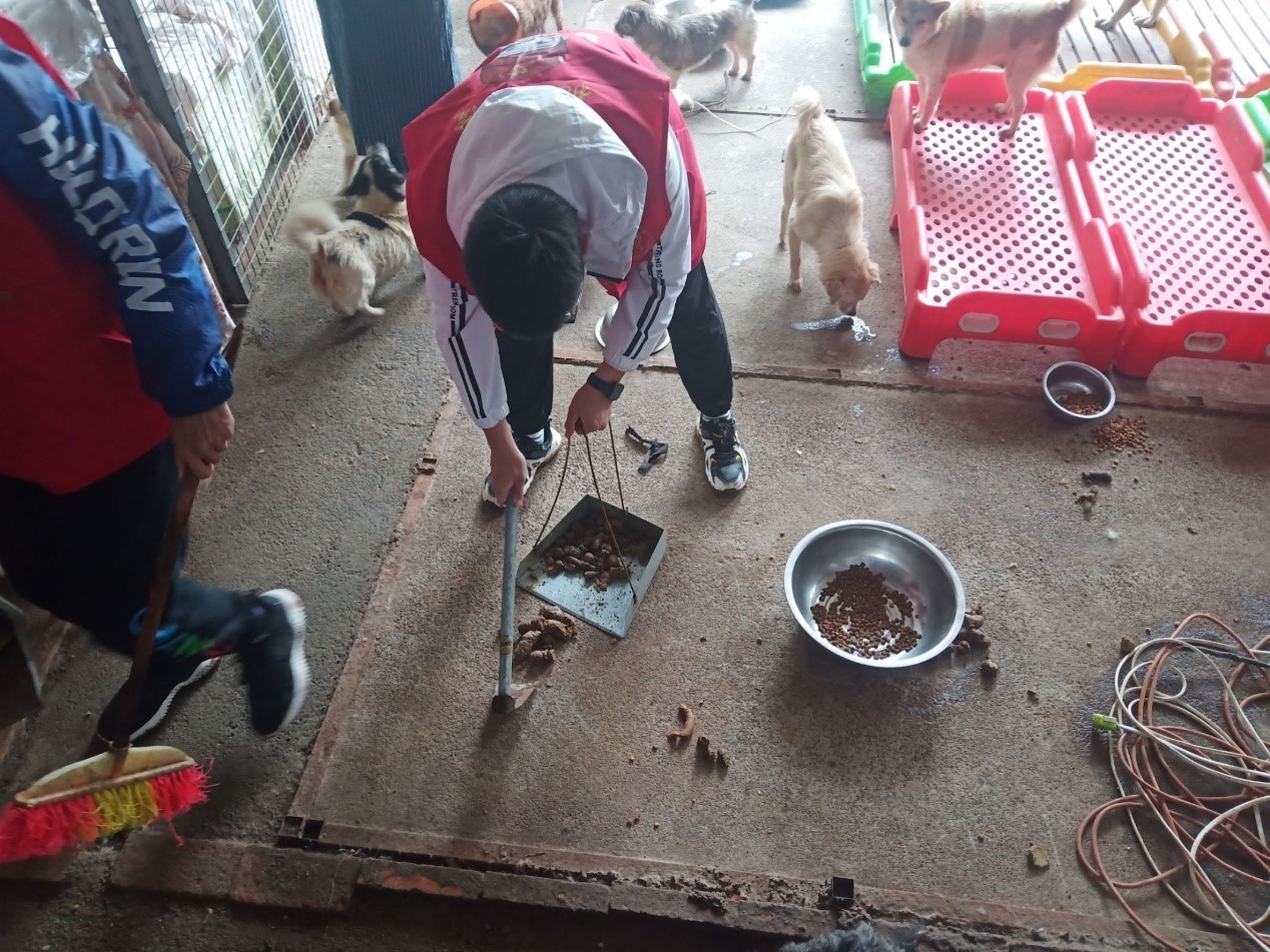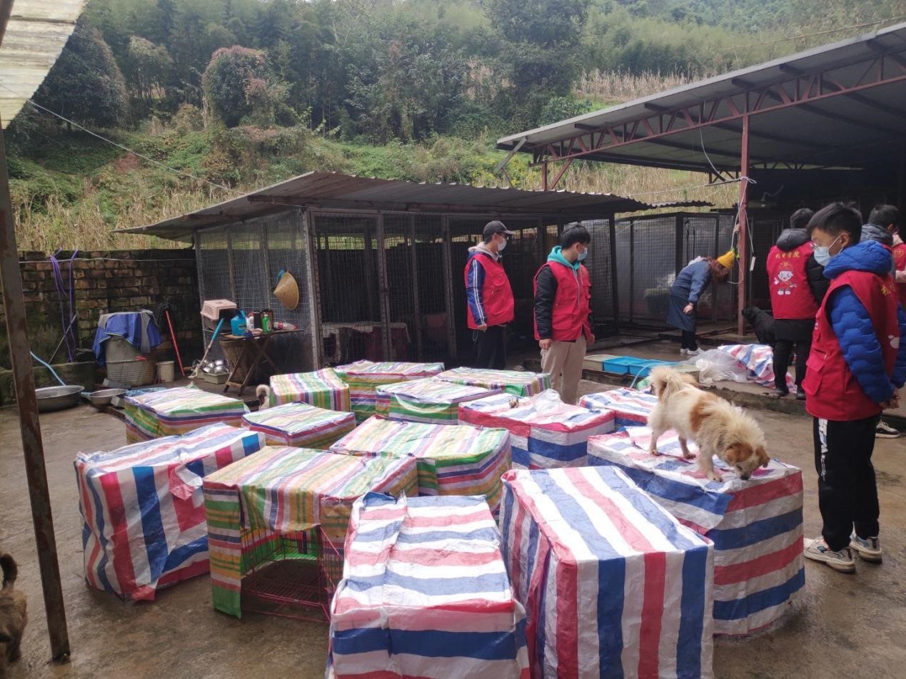 12位志愿者于中午12:30出发到达位于雅安市雨城区的流浪狗基地。流浪狗基地分区明确,年龄较小的狗狗居住在一个大笼子中,而成熟的狗就在基地里放养。志愿者们与狗狗们互动后,便马上投身于基地工作中。首先,对基地内的地面进行了全面清扫,用铲子和扫帚扫除了地面上的粪便,并用水枪清洗了地面。此外,将流浪狗的小窝布置成了防风尼龙布,让流浪狗们可以过一个温暖的冬天。基地里流浪狗居多,流浪狗基地中有许多刚出生的小狗还未打疫苗,为小狗们的茁壮成长,志愿者协助负责人为小狗注射疫苗。