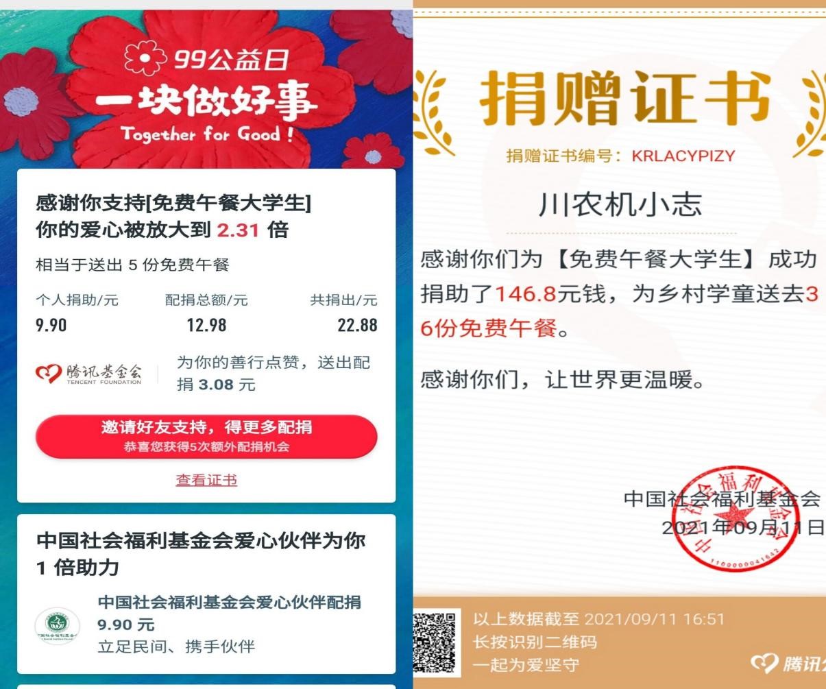 9月14日“99公益日”期间,机电学院志工部为了助力“免费午餐”公益项目,组织以“助力免午,爱心翻倍”为主题的募捐活动,于二区主干道设点开展。