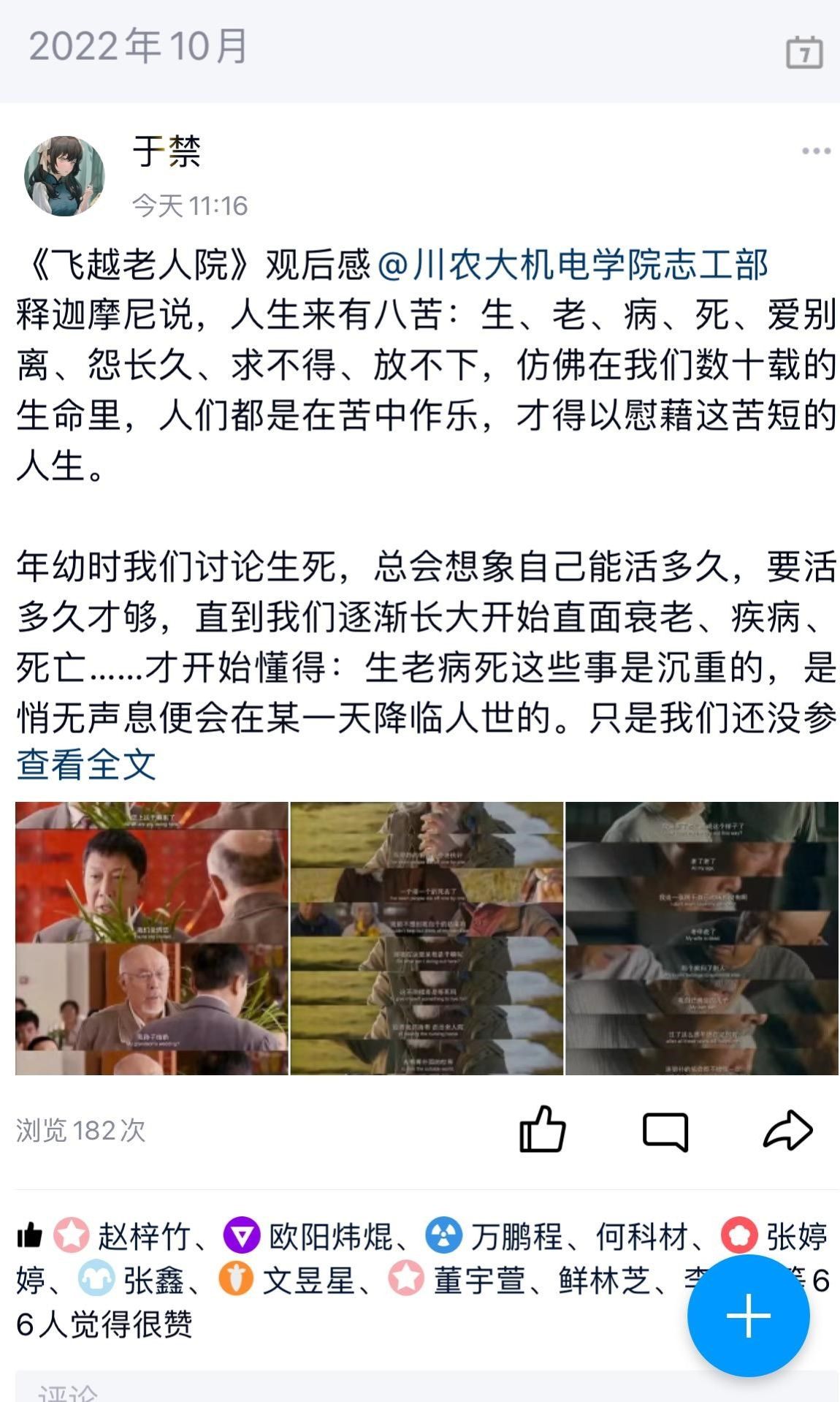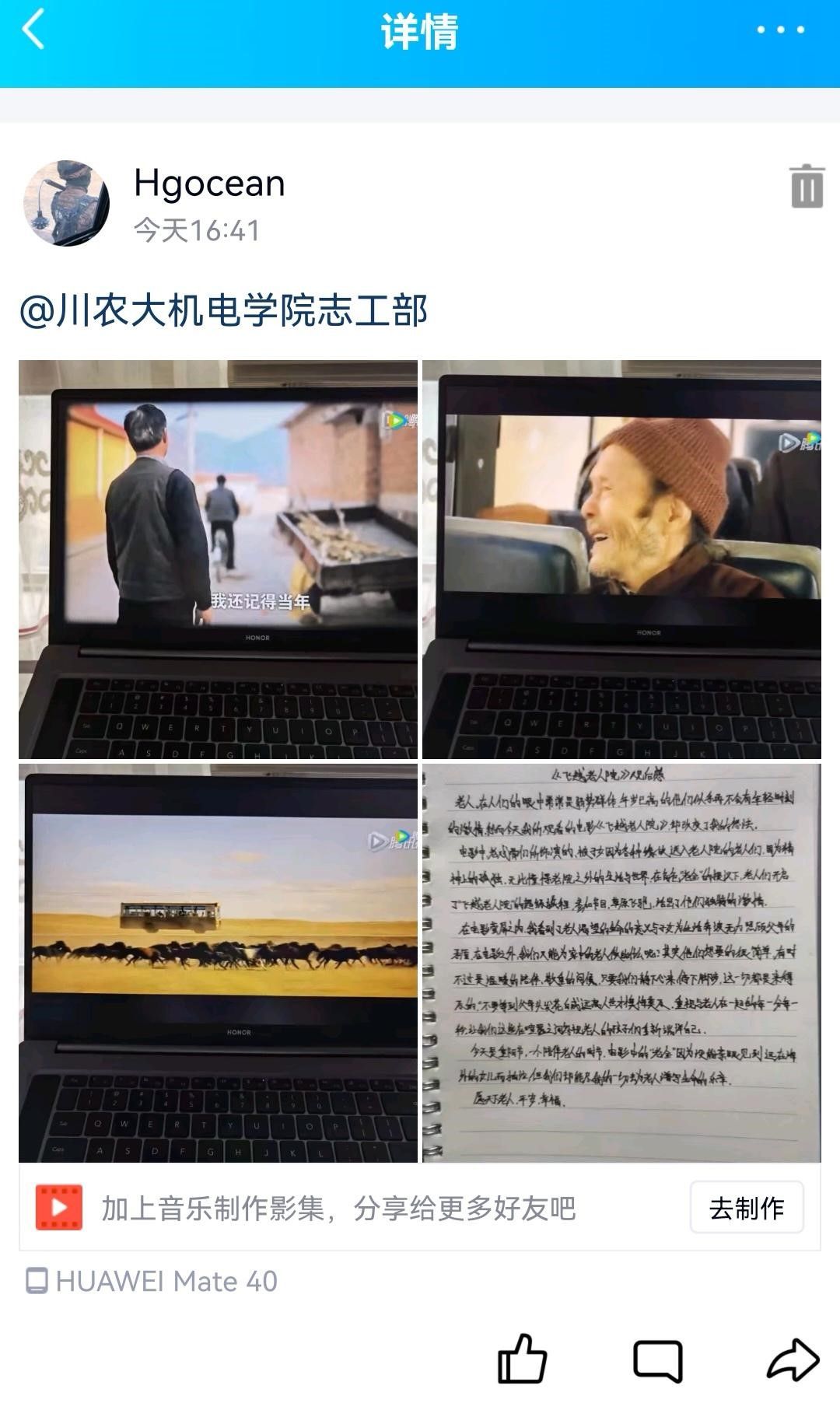 104日正值重阳节,为弘扬重阳节敬老爱老的美好精神,机电学院团委志工部举行了“品出众电影,悟敬老精神”活动,近300名同学在104日当天自行观看了《飞越老人院》经典电影,并在自身的QQ空间发表观后感。最后以表单的形式对同学们的感悟进行了收集。通过观影,同学们表示重阳节是一个很重要的节日,我们需要多去了解理解老人,感恩敬老的中华美好品德需要我们大学生去传承。