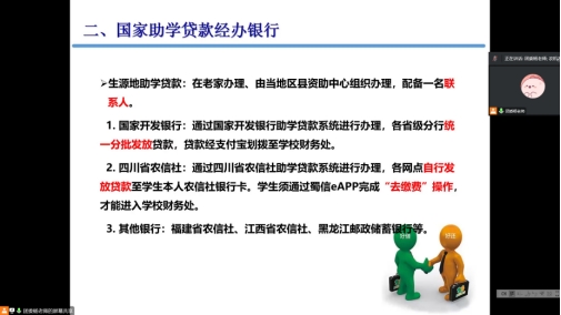 会上,杨梅老师介绍了学生资助项目,解读学校资助工作的政策,要求各班级按照通知要求认真完成困难认定工作。杨梅老师特别强调了今年困难认定申请系统的变更,并简要介绍了四川省学生资助管理系统的操作流程。同时对国家助学贷款的一些政策进行讲解,强调各小班应关注办理国家助学贷款的同学以及其他特殊群体学生,在充分了解学生的情况下,切实开展认定工作。