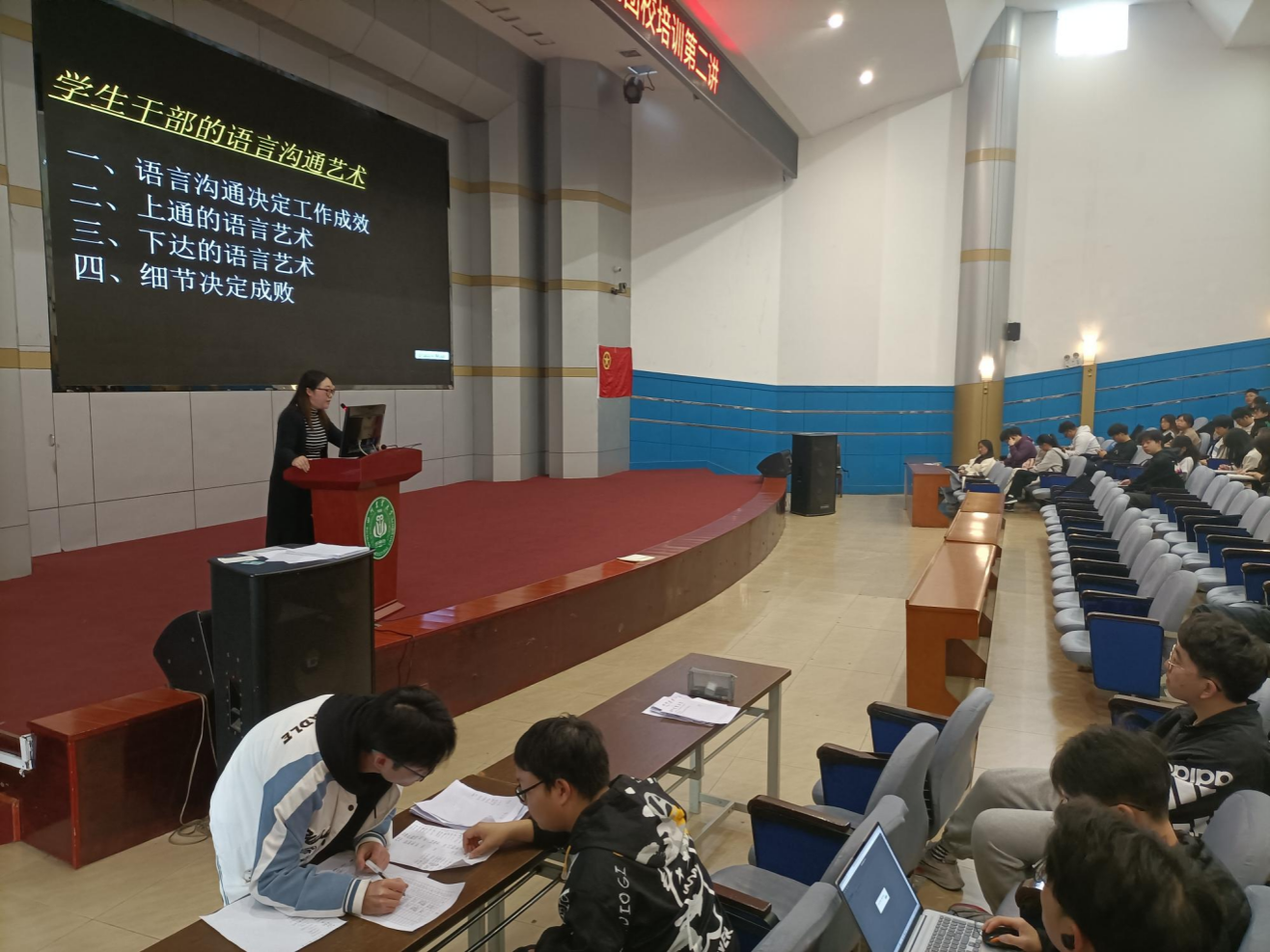 周老师从四个方面给同学们分享了学生干部与人沟通的经验和方法。首先作为学生如何与老师和师兄师姐们沟通,部门学生干部如何与同学们正确相处以及部门成员内部上下级间的合理交往。最后周老师以亲身经历,引出了同学们如何与身边朋友同学相处,亦师亦友,良性竞争,互帮互助才是同学间交往的正确法门。整个过程中同学们认真聆听,全神贯注,收益颇丰。