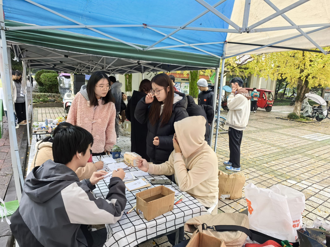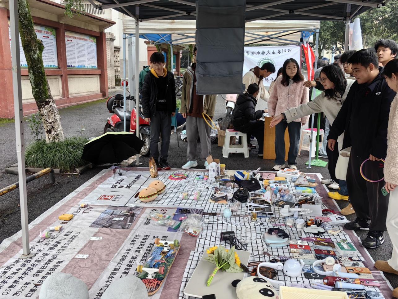 次日,二区杏苑食堂旁的场地也迎来了活动的第二波高潮。同学们继续在这里进行物品的交换与分享,享受着“解忧杂货铺”带来的乐趣与收获。