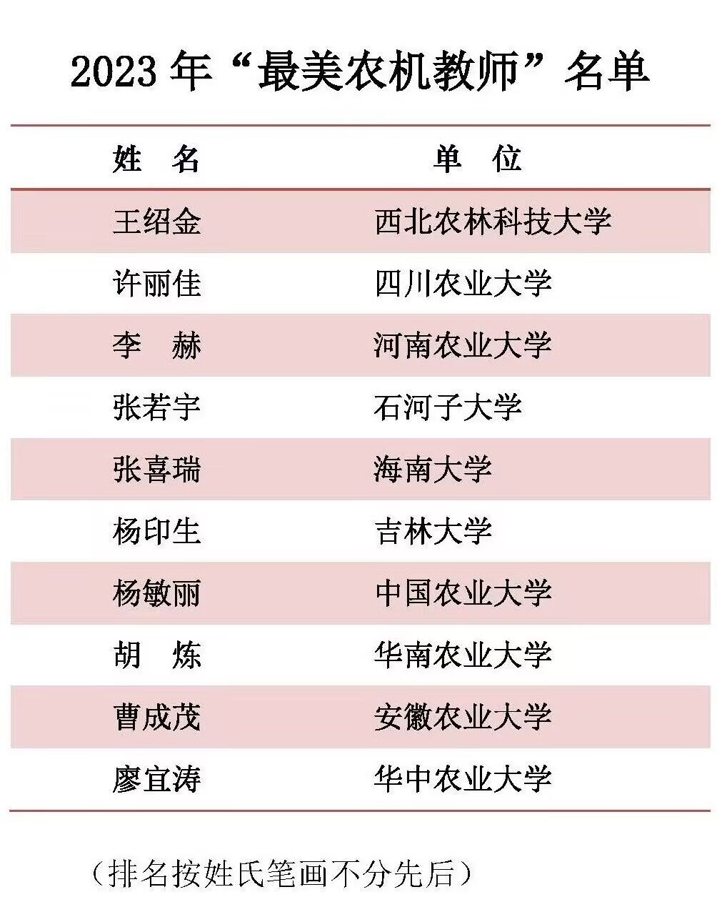 8月10日,中国农业机械学会、中国农业工程学会、中国农机化导报等联合公布了2023年“最美农机教师名单”,我校优秀教师标兵、机电学院院长许丽佳榜上有名。