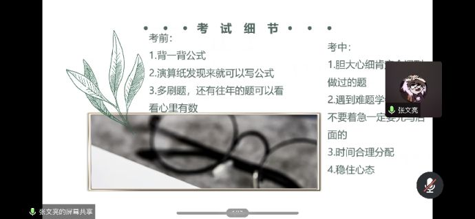 针对即将到来的期末考试,学风建设部特别举办了一期“期末考试复习经验分享”。学风建设部邀请3位成绩优秀的同学分享期末考试备考经验,在强化知识积累的同时,帮助同学们规划期末考试时间安排,传授学习技巧,鼓励同学们在学习上攻坚克难,增强同学们的学习自信,点燃同学们对知识探索的热情。