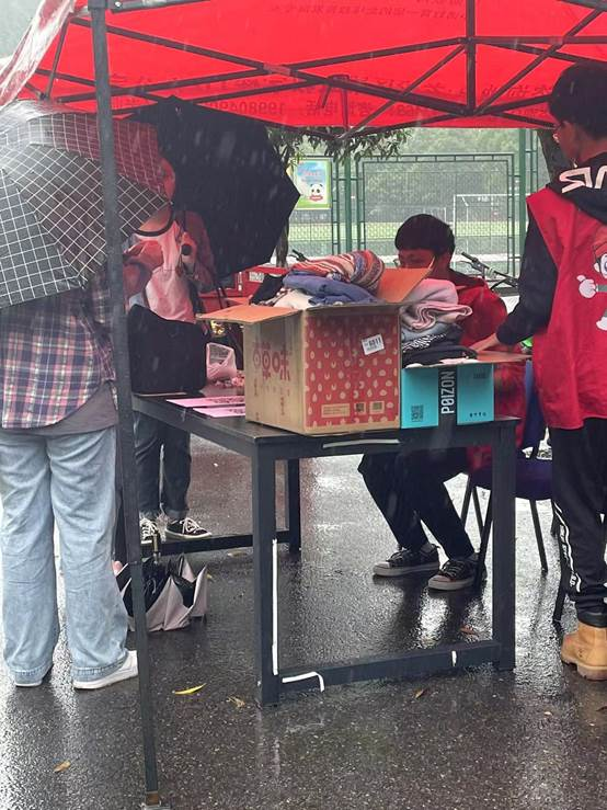 本次活动巧遇阴雨天气,搬运物资不便,原定于10:30准时开始的活动延迟到11:00开始。工作人员在答疑群发出活动时间延迟的公告之后,迅速得到了同学们的支持与谅解,并不断有同学在群里面相继发出“工作人员辛苦了”的话语,让工作人员大受感动。与此同时,各位志愿者在雨中坚守岗位,认真工作,热情地为前来捐衣的同学解疑答惑。