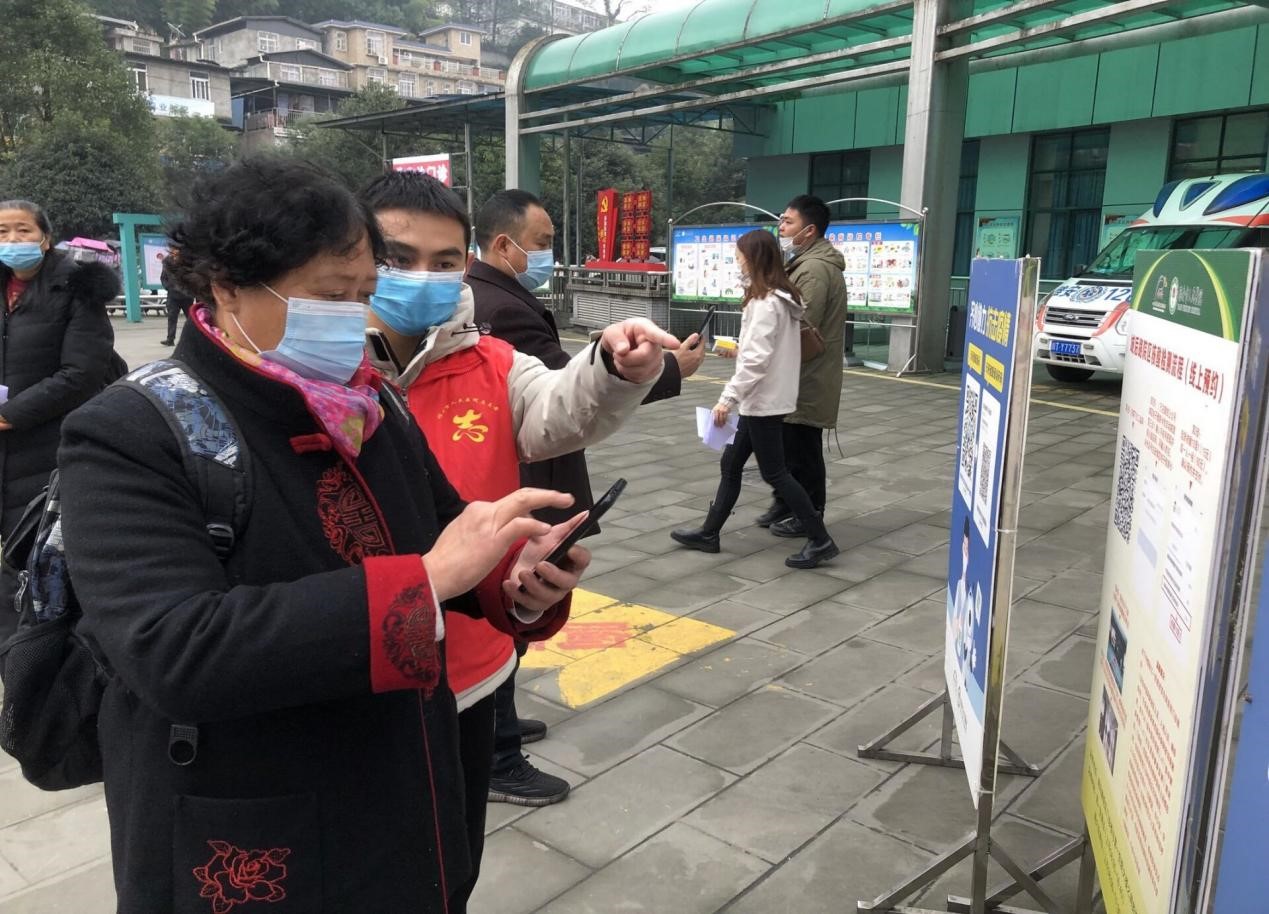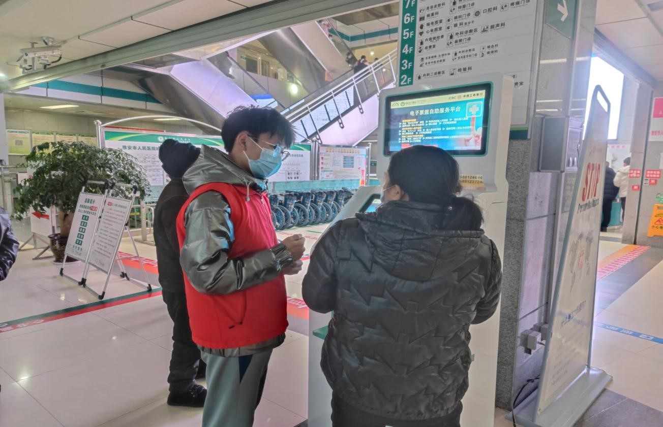 (图为青年志愿者在医院入口处协助检查健康码 李小红 摄)