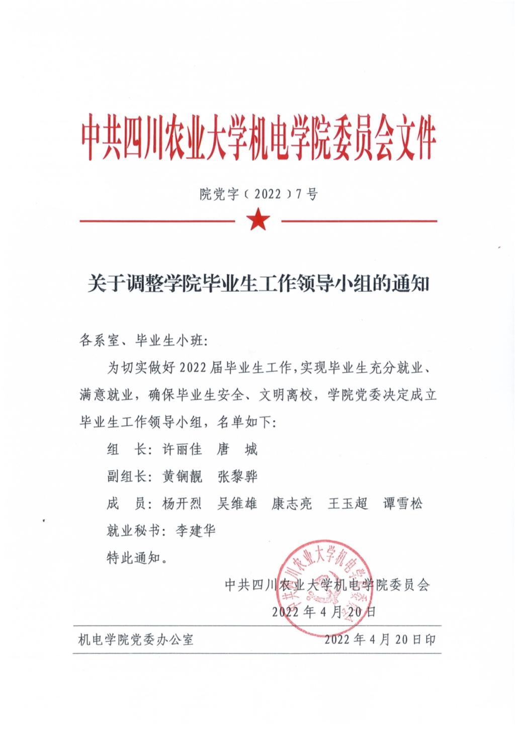 院党字[2022]7号-关于调整学院毕业生工作领导小组的通知