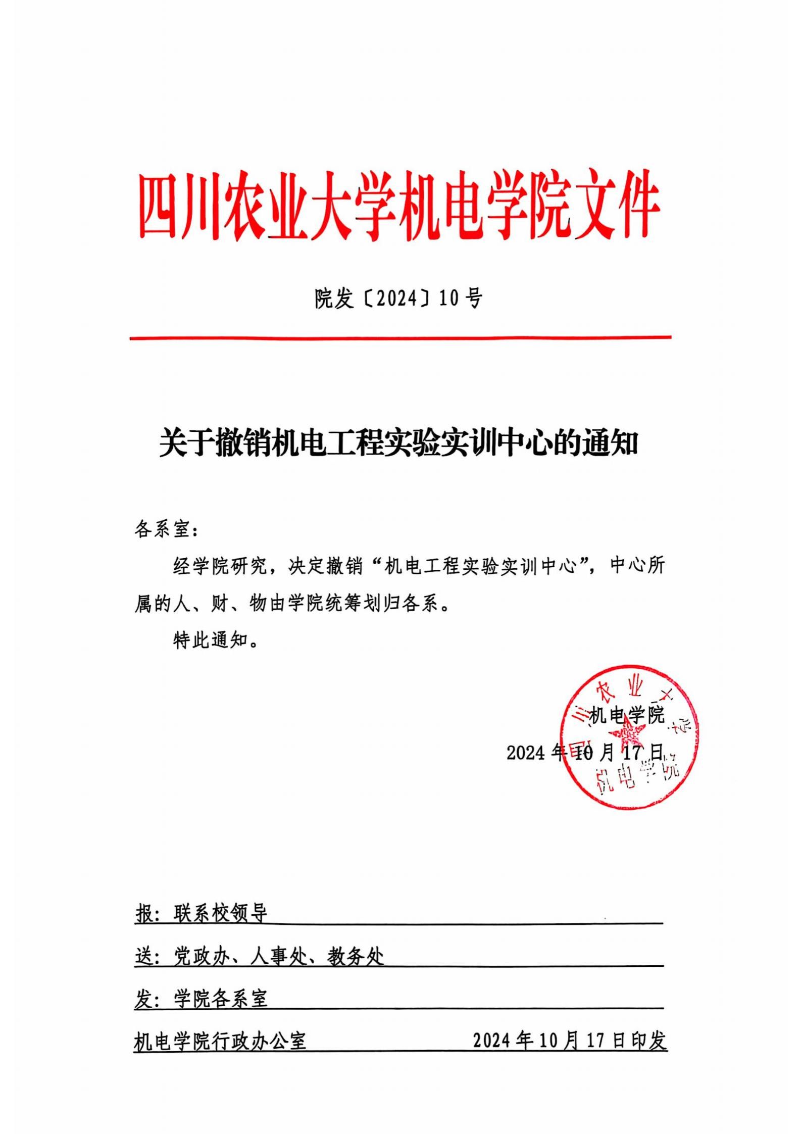 机电学院院发[2024]10号-关于撤销机电工程实验实训中心的通知